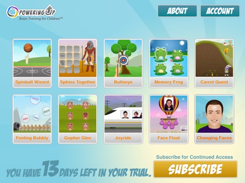 MyBrainSolutions-for-parents subscriptions come bundled with PoweringUp access for your child. Start your access through an initial 14 day free trial period. Following your trial, you can choose to subscribe to premium access. Your premium subscription will be auto-renewed on a monthly or annual basis until cancelled. Your child will receive continued access to 2 PoweringUp games even if a premium subscription is not activated.