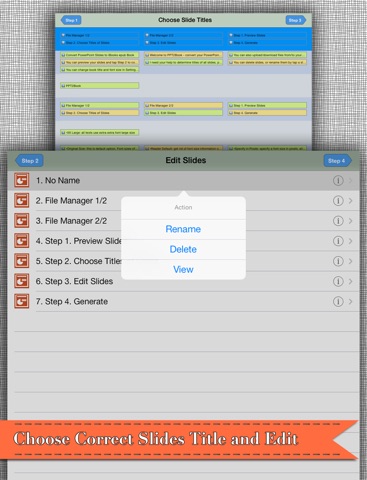 - convert your PowerPoint slides to EPub books in 4 simple steps: review document, choose correct slide titles, edit slides and generate.