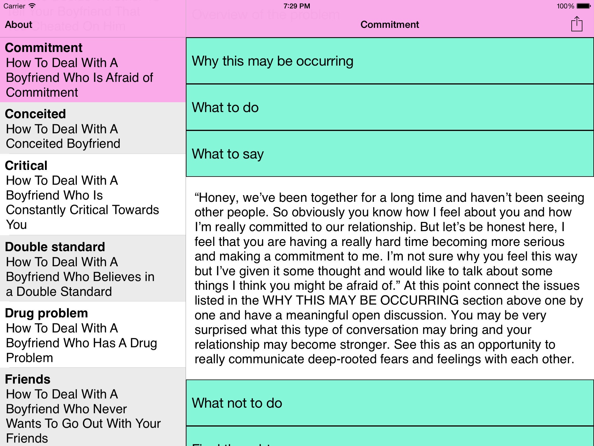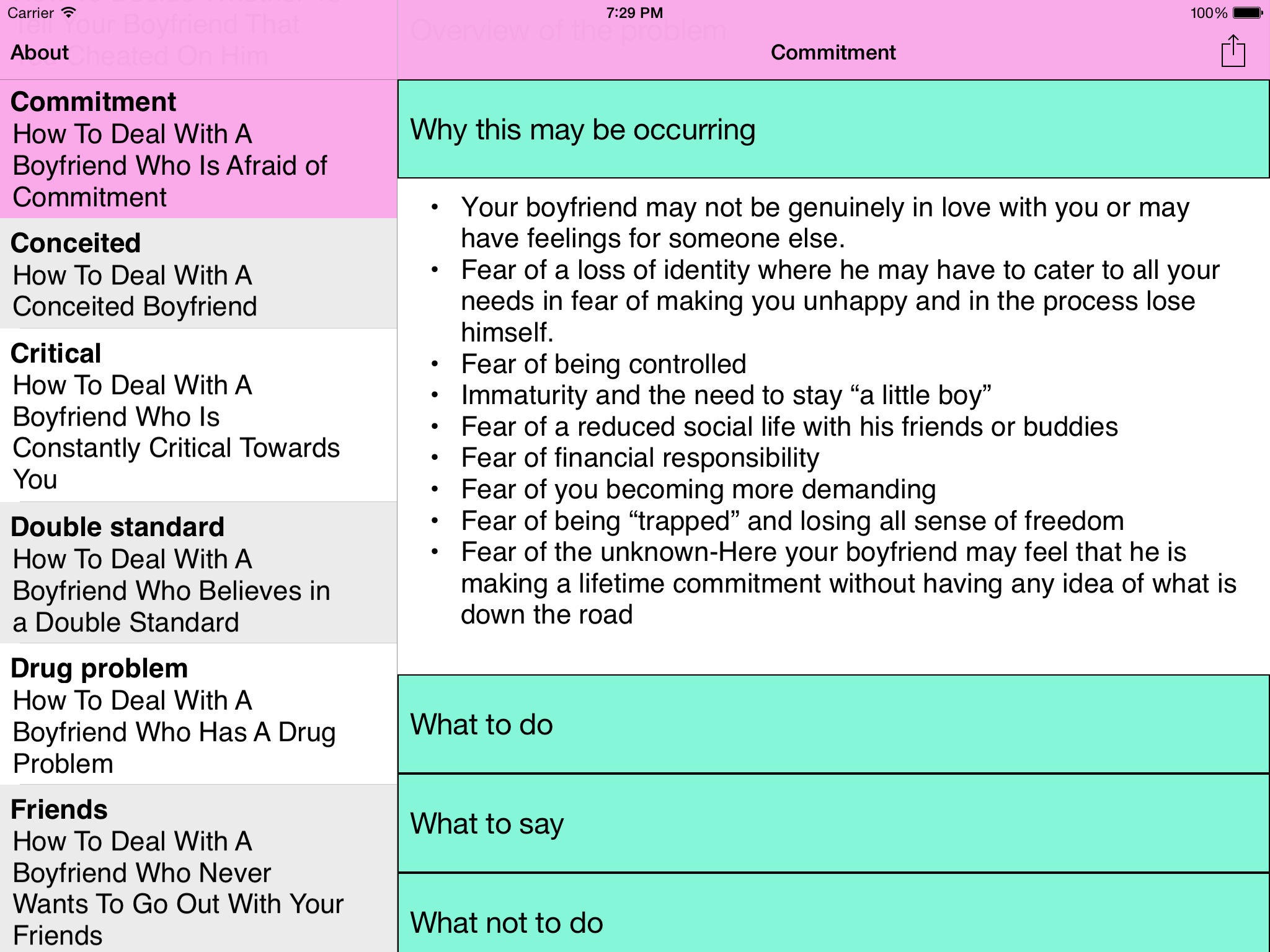 Have you ever been involved or are currently in relationship with a boyfriend and not known either what to say in a difficult situation or wondered why he acted the way that he did? Well, millions of girls and women feel the same way but do not have the opportunity or resources to seek professional advice. Our app, Why Boyfriends Do What They Do and What to Do When They Do It, offers sound advice on many common crises, situations, conflicts and interactions that girls and women encounter every day in their relationships with their boyfriends. Advice on dealing with lack of confidence, sex, assertiveness, hostility or shyness, aggressive boyfriends, boyfriends who constantly need to be the center of attention, and much, much, more is included in this app.