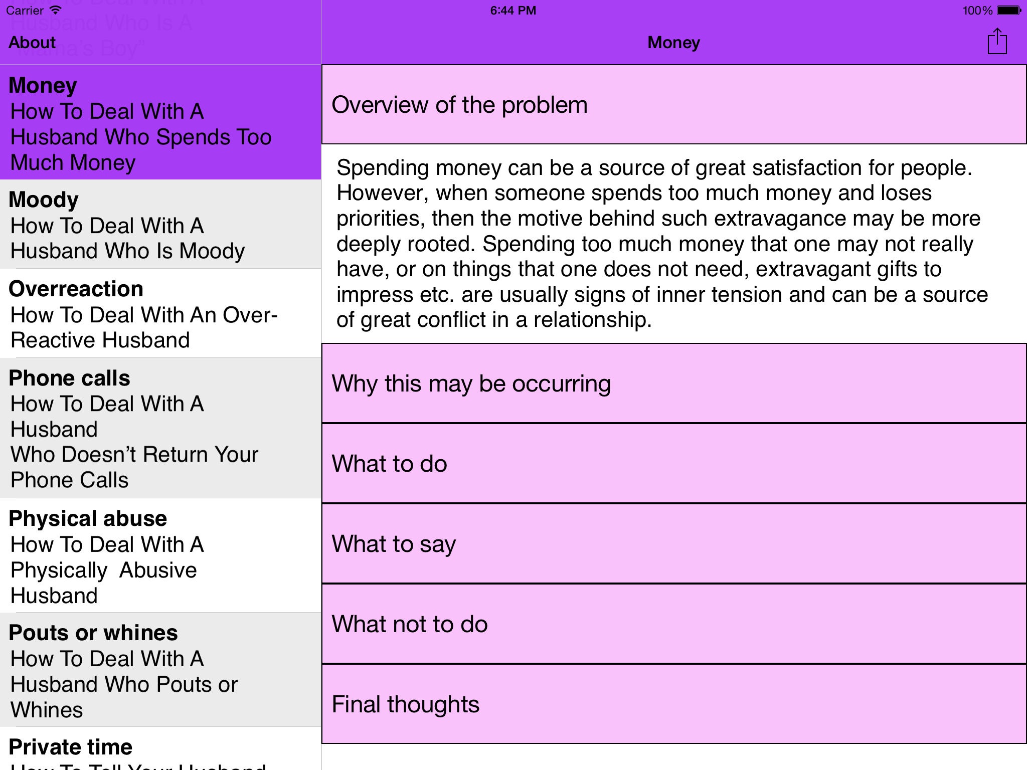 Are you currently married to a man and not known either what to say in a difficult situation or wondered why your husband acted the way that he did? Well, millions of wives feel the same way but do not have the opportunity or resources to seek professional advice. Our app, Why Husbands Do What They Do and What to Do When They Do It, offers sound advice on many common crises, situations, conflicts and interactions that wives encounter every day in their marriages with their husbands. Advice on dealing with lack of confidence, sex, assertiveness, hostility or shyness, aggressive husbands, husbands who constantly need to be the center of attention, and much, much, more is included in this app.