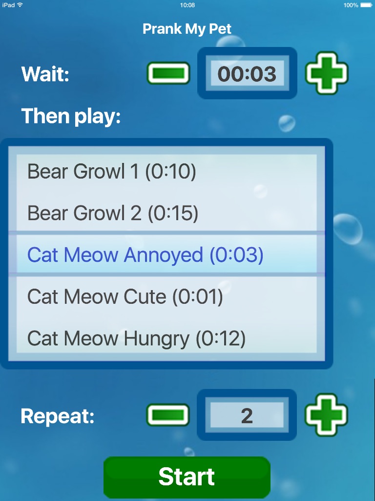 Pick your sounds and timing, click start, then set the app down and stand back... when the app starts making noise, watch your pet try to figure out whats going on!!