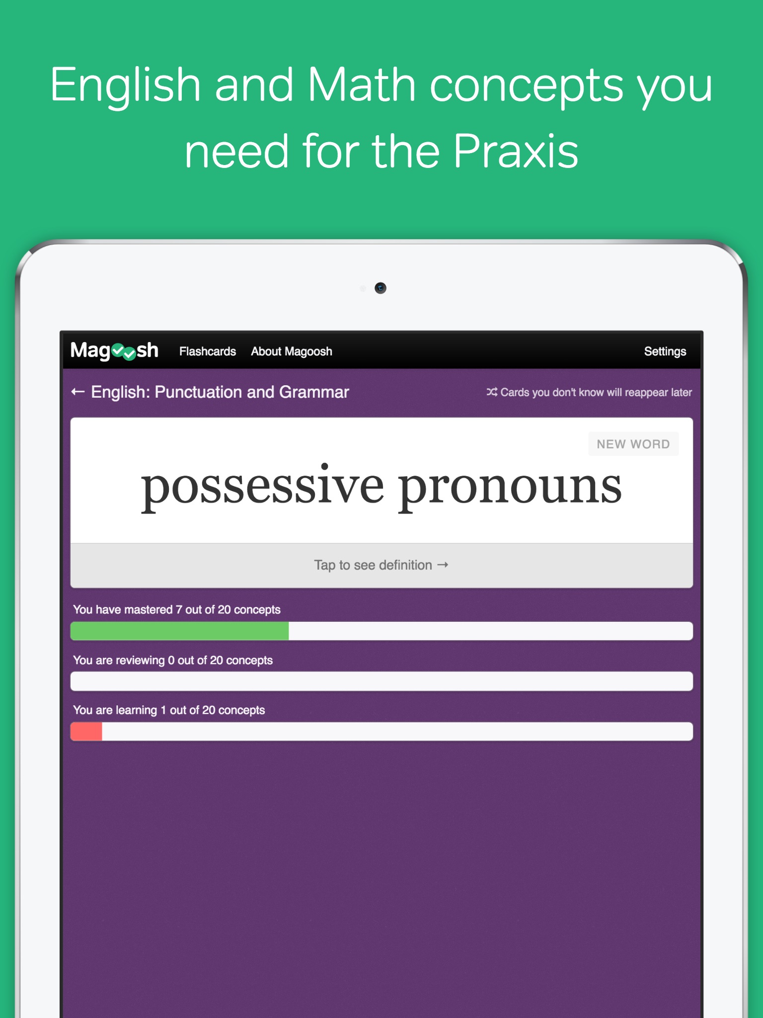 Get ready for the Praxis Core teaching exams with this research-based Praxis App. It will help you study for the Praxis Reading, Writing and Math by teaching you key concepts with flashcards. It is an essential for all Praxis prep.