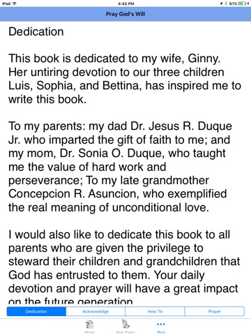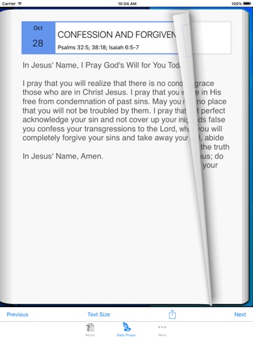 I am blessed by this application. My only criticism is that I would like the Prayer pages to come up first when launched instead of the About page.