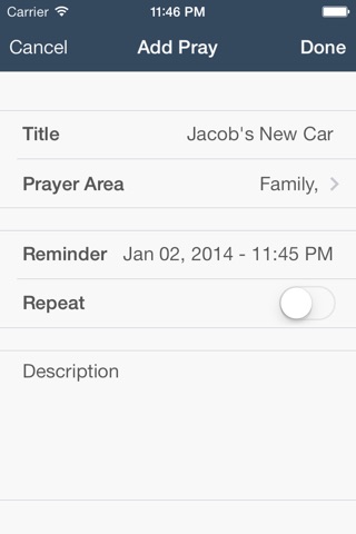 - add prays by title, areas, reminder, and description
