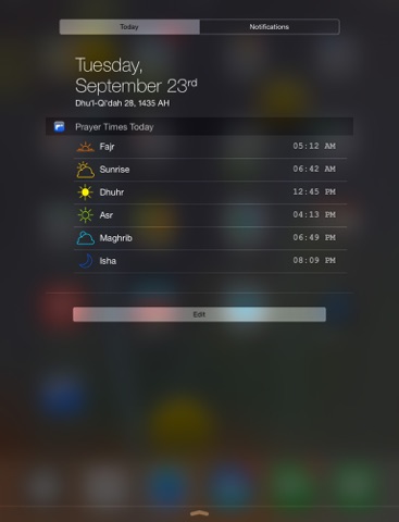 Now you can see the times of prayer in a practical and very efficient way, thanks to the iOS widget, you will not have to open special application anymore to give a glance at today prayer times, all you need is to pull down Today menu or add the widget on your home screen and youll see how its easy to view prayer times.