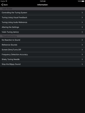 All that aside, every single aspect of the Precision Violin Tuner has been designed to ease the task of tuning your violin. Simplicity is key. Sporting a sleek, cleverly designed interface, the amount of screen tapping is kept to an absolute minimum. It is even possible to tune without tapping a single thing. Just open up the app, tune, and play beautiful music. There is even a helpful built-in tuning guide for all you beginners out there!