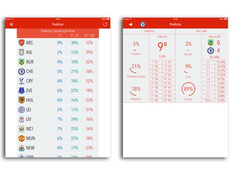 Predictor calculates the probability for each team win their matches, the final score, become the champion, relegation, and classify for Champions League.