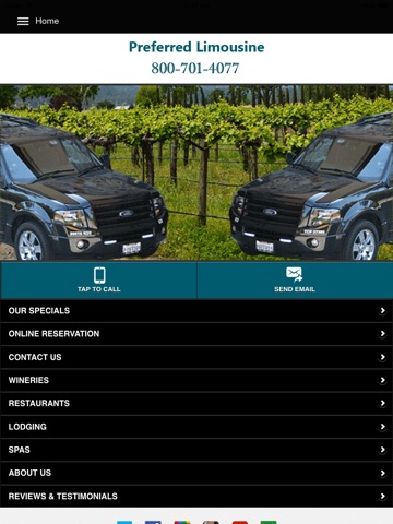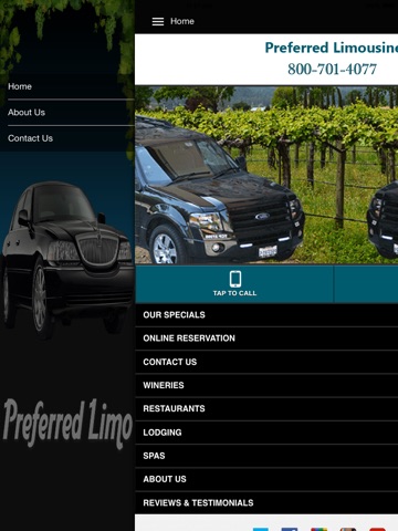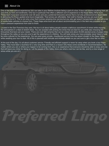 For over 20 years Preferred Limousines has been recognized as dependable and professional Limousine company to deliver finest guided wine tours in Napa Valley and Sonoma area.Preferred Limousines also specializes in San Francisco Bay Area limousine tours and will always add the unforgettable memories to all your special occasions. Our biggest goal and commitment is to deliver courteous service to our customers.Users can get to know about our specials offer, reservations, wineries ,restaurants , lodging facilities, Spas etc through this app