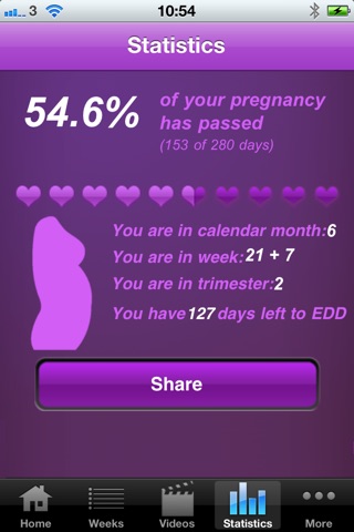 The statistics feature will help you be on top of your pregnancy. From now on you will know exactly how many days there are left to EDD; you will know how many days and what percentage of the pregnancy that has passed, you can share this data with your friends on Face Book, Twitter and by e-mail.