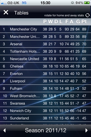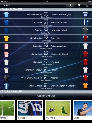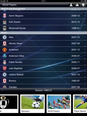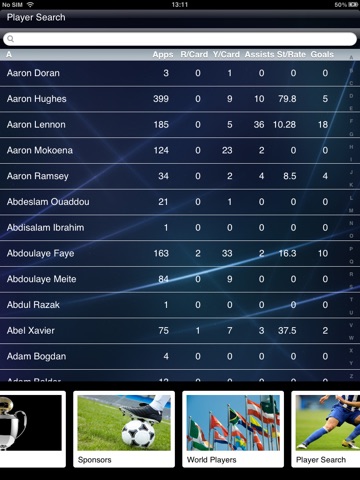 - Player search, including stats on goals, appearances, red and yellow cards.