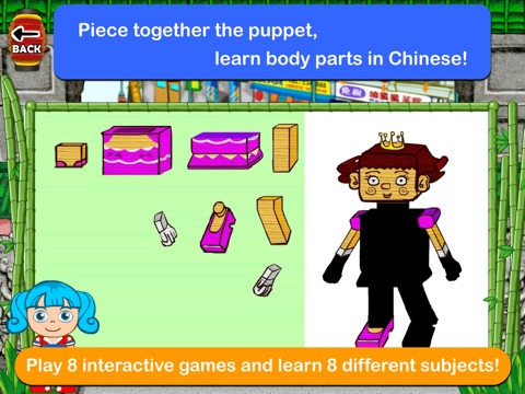 - Body Parts: Head, arm, neck… Piece together the puppets’ body parts and learn the Chinese names of face parts!