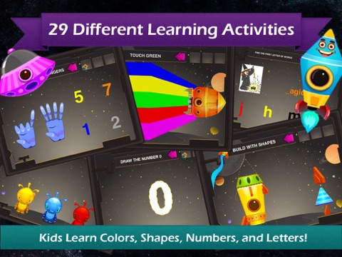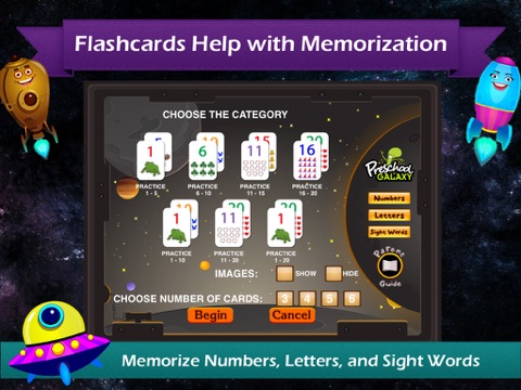 On top of the 29 activities, 24 collectible rockets, and 2 rocket games, Preschool Galaxy also includes flashcards to help with your childs learning of numbers, letters, and even sight words! Flashcards are perfect for your child to do alone or enhanced when parents participate with their child.