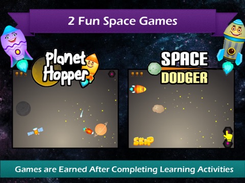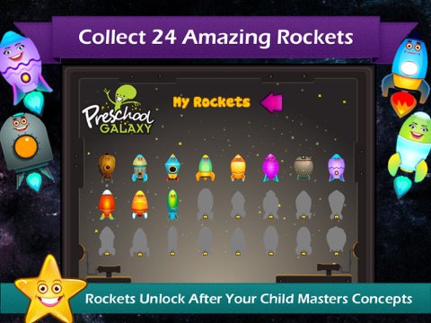 WE REWARD SUCCESS - Rewarding success encourages learning and encourages your child to spend time on learning applications vs. generic games. Each time a child does well on activities in Preschool Galaxy they can earn Galaxy Stars, 24 different playable rockets, and a chance to play one of the two exciting rocket games with the new rockets they earned.