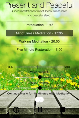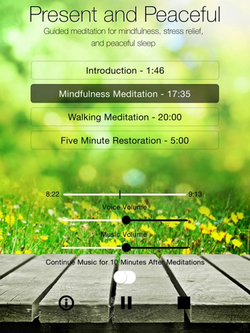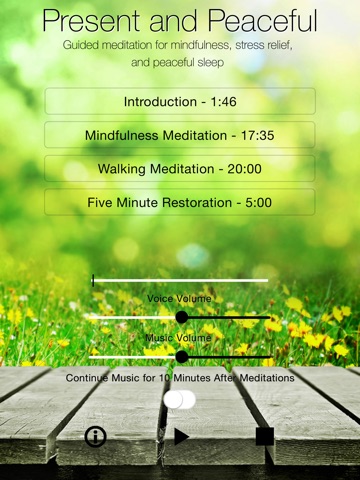 ** Present and Peaceful includes a feature that allows you to play your own music in the background - choose your favorite music to enhance your meditation experience.