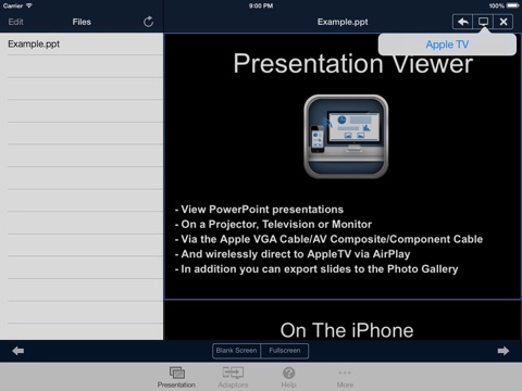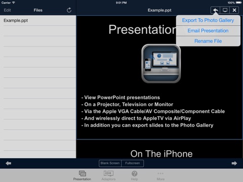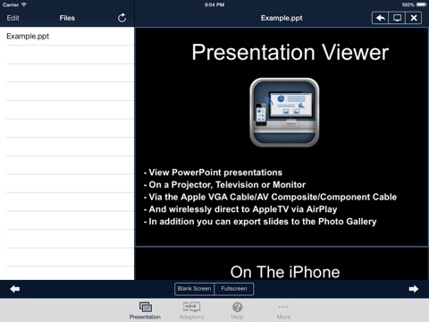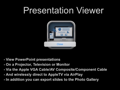 Realmente não entendi a resenha que disse que ele não funcionava. Por conta disso quase não o baixei, mas como é gratuito resolvi arriscar, pois não achei outro do gênero para IPOD. Felizmente deu certo. Estava cansada de ter que transformar meus arqivos de powerpoint em imagens ou vídeos para poder exibir com projetores. Uso para dar aulas, e foi realmente um app utilíssimo. É bem simples mas funciona sim. Conservou toda a formatação e exibiu gráficos e imagens perfeitamente. Testei com ppt, com pptx não funcionou, mas é só uma questão de converter no próprio powerpoint de um jeito bem mais fácil.