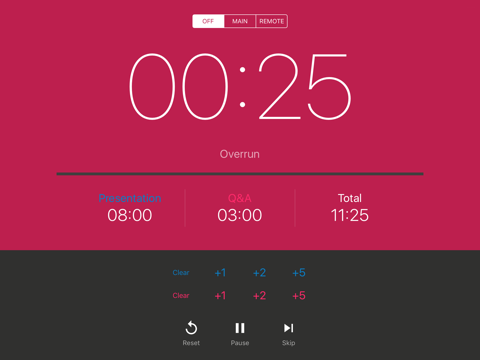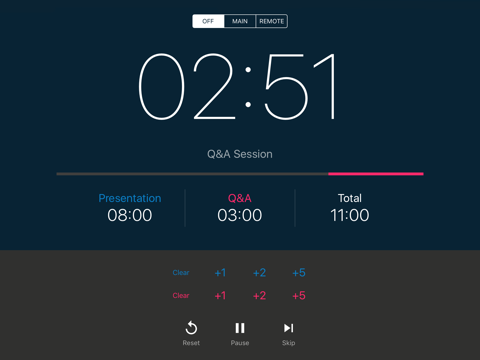 PresenTimer is a timer application designed for presentation. Presentation time and Q&A timer can be set and edited with a simple and direct user interface in real-time. The remote control feature also allows you to control another device running PresenTimer remotely.