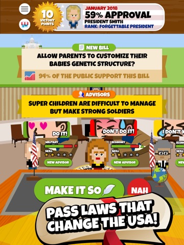 Can you make America great again - or will you lead the country to despair and collapse? Over one hundred challenging decisions await your presidential order as you react to new bills passed in congress and decide what becomes law in the USA. This isnt just a President Simulator, but a political simulator too!
