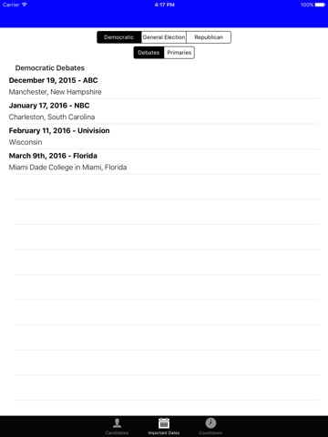 - Party specific upcoming important dates for debates, primaries, and caucuses