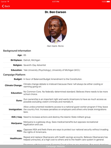 Please dont forget to give an honest review and tell me what you are wanting in future versions! I am here to bring you all the information necessary in order to educate yourself and other people around you on the 2016 Presidential Candidates. Making the right, educated decision at the polls is a hard task, and what better way to be educated than a free app that offers you information on all the candidates.