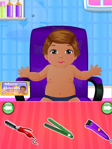 This is a super cute hair salon game for babies and newborns. You first have to wash the baby before you can cut the hair. Take good care of the baby and wash his or her hair and body. You are the hairdresser, you can give the baby a nice new haircut! Wash, curl, style and cut the hair of your customer. After that you can be a real fashion stylist! Dressup the little baby in the most beautiful clothes! Give the baby a total makeover with new clothes and a new hairdo!