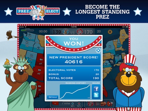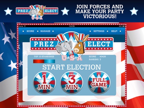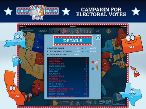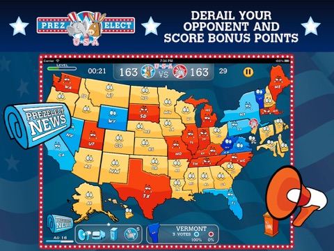 Choose "Donky" or "Elefant", the party that best represents you and campaign for the electoral votes in all 50 states and the District of Columbia. Join forces with others who share your political ideals and make your party victorious!