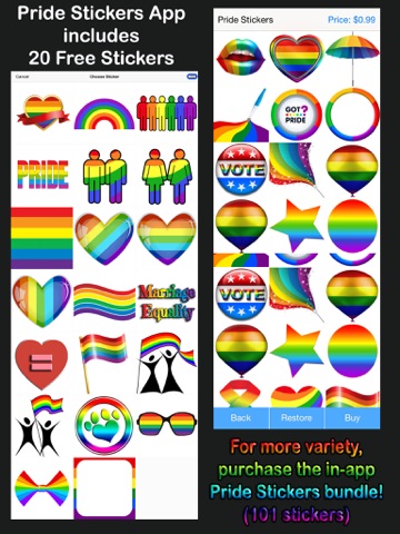 The free version of Pride Stickers includes a variety pack of 24 pride-themed stickers and messages, as well as the full use of the text generator and save/share functions. For additional sticker options, we have the Pride Stickers Bundle of 102 stickers available as a $0.99 in-app purchase.