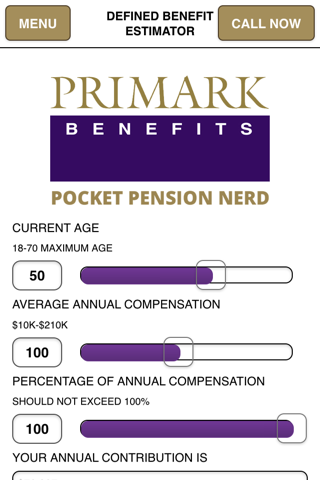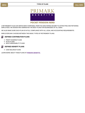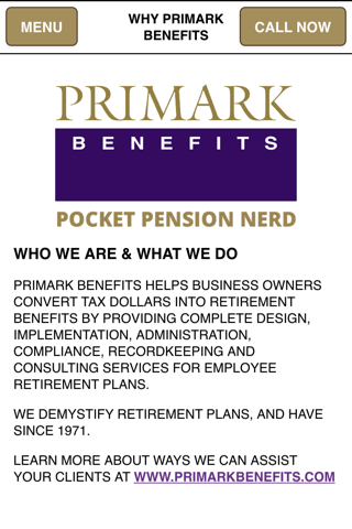 Primark Benefits Pocket Pension Nerd is designed for Financial Advisors, CPAs and Human Resource Professional to help them answer common questions about pension and retirement plans. It’s also a great planning tool for employees, contractors, the self-employed and others planning for their retirement. Tools include a Defined Benefits Estimator, Pension Limit Charts, and a brief review of several types of retirement plans.