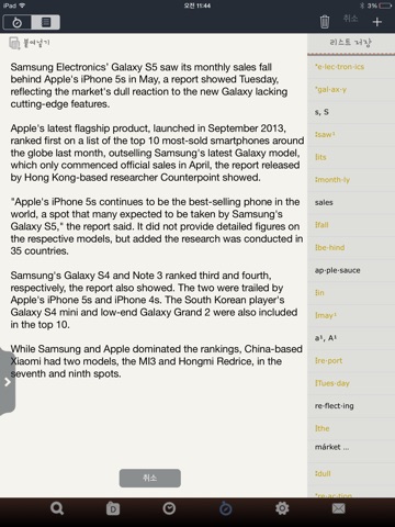 사용한지 8주가 넘어가는데 이제 도저히 못참겠어서 리뷰 올립니다. 일단 가장 중요한 기능인 오타 단어 검색이 없습니다. 스펠 하나 모르면 그것으로 끝임. 그리고 단어도 그렇게 많지도 않아서 조금 전문단어 검색만 하면 안뜸. 단어 뜻을 볼때도 내려가 보려고 하면 드래그로 인식해서 계속 삽질하고. 음악듣다가 사전앱 누르면 부팅하면서 음악 .5초 정도 정지하고... 그나마 별 두개 준것은 하이라이트 기능하고 단어장기능, 간간히 섞여있는 그림설명때문에 그런것임. 차라리 $1.50 주고 산 외국 영영사전이 훨씬 나음. 별 5개 받고싶음 적어도 스펠링체크 기능이라도 추가하셈. 앱 색깔 갈색인것도 두고두고 거슬림 국어사전처럼 좀 다른색깔로 바꾸세요. 단어 업뎃좀 하시구요. 올인을 영한사전이 훨씬낫네. ㅡㅡ