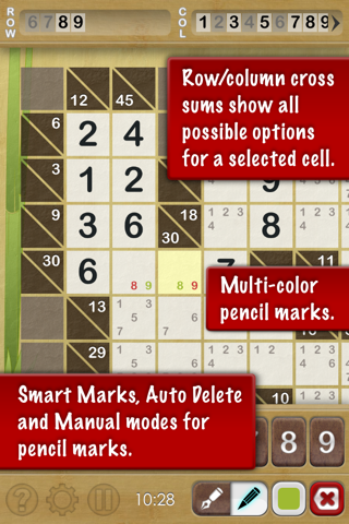 ✔ Row/column cross sum displays that show all possible number options for a selected cell