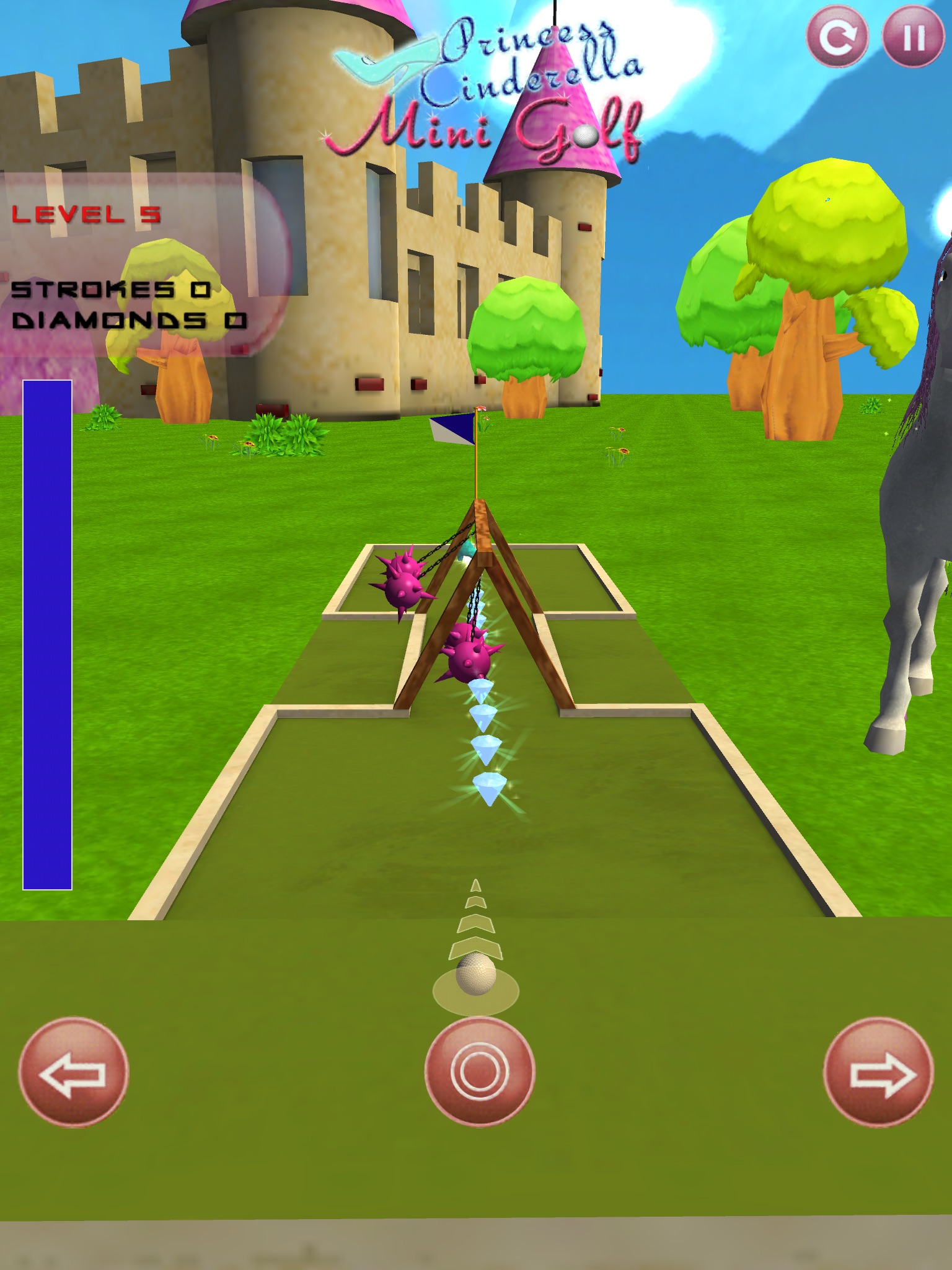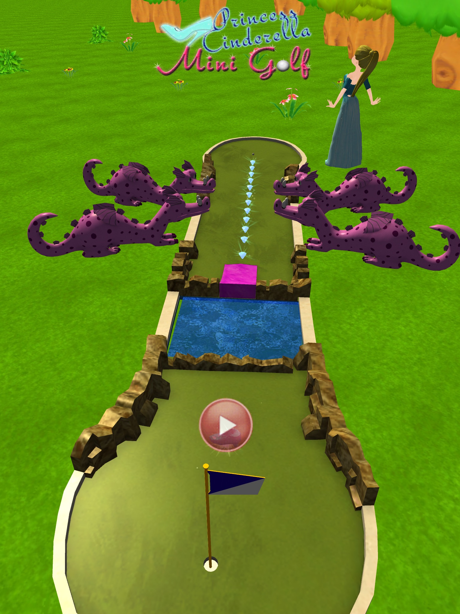 Find the shortest and easiest path to the hole and remember to collect the crystal slipper to rise your score. Do not hit the golf ball too hard, or you will end up with your ball knocked into the water, out of track or else.
