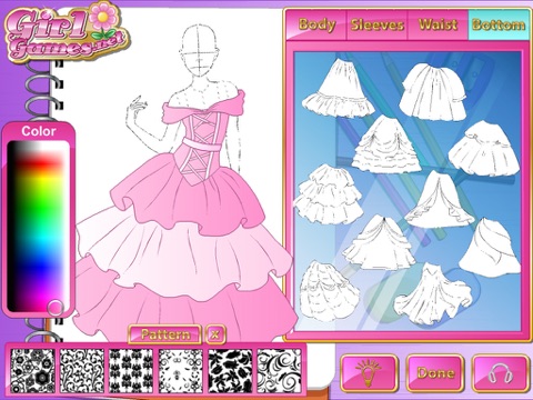 Its time to open your fashion studio for this lovely princess too! She needs a new dress and your are the best designer in the world. Can you spoil her with a lovely makeover? Select 4 garments and pick a nice color and pattern for each item. Next take your fabrics, cut them and sew them up with the sewing machine. In the end she must show your beautiful creation to her prince charming. Will he like it?