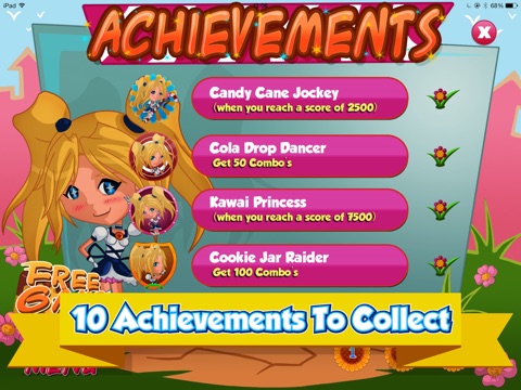 Have fun and tap your way through 25 levels of awesome fun across 5 different candy worlds and see if you can collect all 10 achievements along the way.