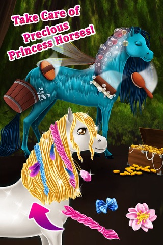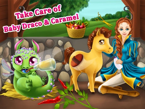 Take care of adorable royal horses - Beauty, Thunder, Daisy, Windy and baby Caramel - and magical baby dragon Draco! Clean up the stables and learn to change horseshoes. Make fresh fruit and vegetable salad for the royal pets. Wash and groom princess’s horses so they all look sparkly and magical!