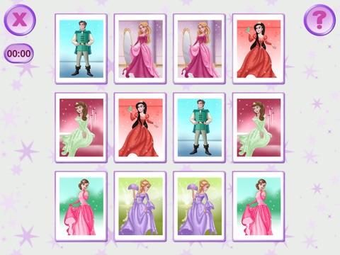 Press any 2 cards, and they will flip. If both cards have the same princesses, they will stay open. If the pictures are different, the cards will close again. Your task is to keep opening cards randomly to memorize the pictures on them and finally open all the cards on the field.