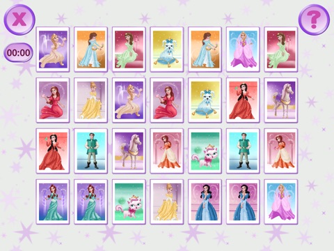 The popular Pairs game (also known as Concentration, Pelmanism, Shinkei-suijaku, Pexeso) to train your kids attention and memory, with multiple difficulty levels and pictures which girls will love: princesses, princes, royal horses and other animals. You can select the difficulty of the game, between just 4 cards and as many as 28 cards, to suit your daughters age and ability. Girls can play this game alone, though parents may wish to explain to them the rules of the game at start.