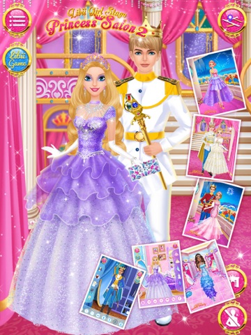 Open Princess Salon II, choose a princess you like most to start the game, then you’ll find her appearing on a colorful street. Along the street you’ll see a few rooms, in sequence they are the SPA room, in which the princess can have a relaxing spa to make sure her hair and skin are flawless already to dance on the stage. Next, you’ll see Beauty Room, here you can help her choose a hair style, eye color and put the makeup on. After that, you’ll come to the Fashion Mall and assist her to select an amazing princess dress, gloves, stockings, shoes, and the matched accessories. And beside the Fashion Mall, here comes the Prince’s House. In the house, there are 4 princes, you can choose one you like most and change suits for him, such as the coats, trousers, capes and so on. After your princess and prince get well dressed, you can enter your wonderful cloakroom to take photos. If you like, you can click the male icon on the bottom right corner to take photos for your princess and prince together, or change suits for the prince. By the way, (please notice that)when the princess is on the street, you can click the icon on the top right corner to check the uncompleted tasks. If you complete them, you will earn new prince’s suits, and pieces to unlock the Palace Hall and the Cruise. Of course, you can directly get these two scenes by purchasing. Now, please be excited to enjoy your fantastic princess life!!!