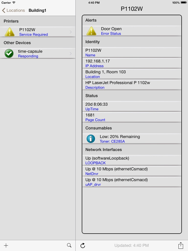 PrinterMonitor can detect if a printer is online, display alerts for the device, its identity, location and uptime, and depending on the printers capabilities, report status of consumables (paper, toner/ink, imaging drum life, etc.).