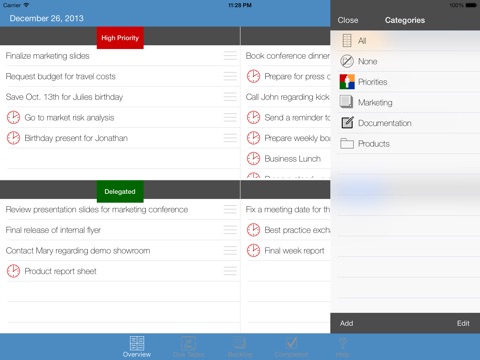 Applying the Eisenhower methodology, Priorities helps you sorting tasks into the right category, depending on their urgency and importance.