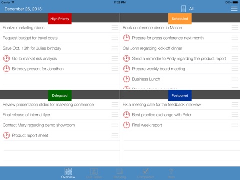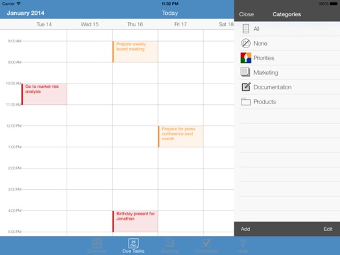 Beside the overview sorting tasks into quadrants after Eisenhowers methodology, Priorities also offers a calendar view where you can view and add tasks based on their due dates. Priorities user interface is optimized for ease of use and one thumb usage on the iPhone.