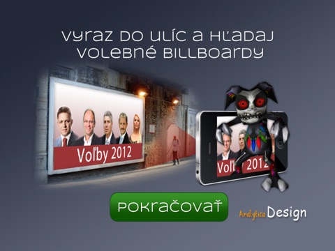 This application is a fiction for entertainment and public interest elevation purpose of Slovakian parliament elections 2012. Application is using augmented reality to show 3D animated characters of politicians when device camera is pointing to billboard advertisement. So to see the app in action you’d ideally be out in the street of Slovakia. If you are reading this English text you are probably not so if you want to check out the app you can go to Facebook on your computer and open page of “Priserky” app, go to photogalery and open pics of billboards there. Launch the app on a phone, point the device camera to billboard pic on the computer screen. Then have fun with Slovakian dictionary to translate stuff ;o)