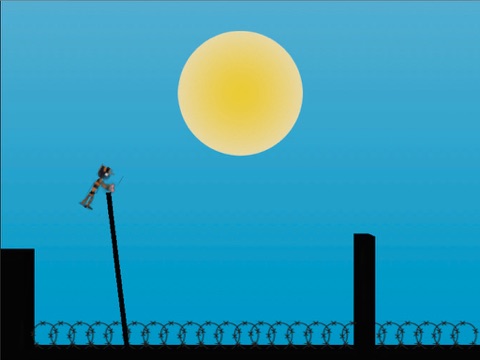 He will stretch the stick, places the stick on the ground and jump to the next wall until he gets out of the prison.
