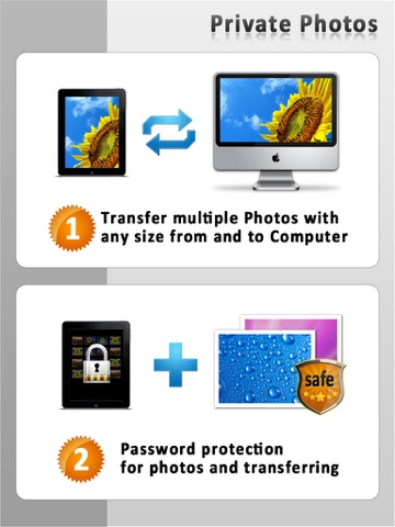 Transferring your photos to the app is simple. You can easily access your private photos via WIFI from desktop/laptops web browser (Make sure your desktop/laptop is in the same WIFI network as your iPad). When connected to your iPad from web browser, you can select and transfer multiple photos with one click. The transferring is also protected by the same password.