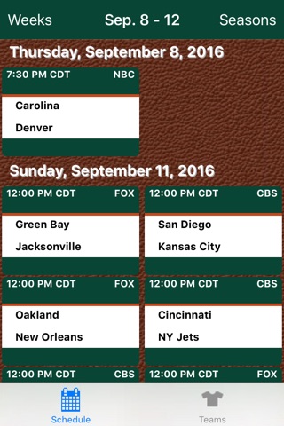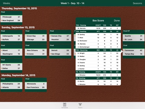 Check the schedule / scores for your favorite teams or browse the schedule by week.
