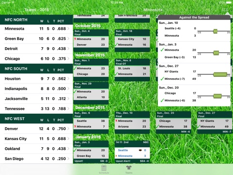 - Features in-game score updates, point spread, and against-the-spread history by team.