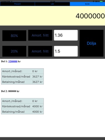 + Can enter different scheme (amortering fritt, 1 to 50 years) and can change percents for each scheme.