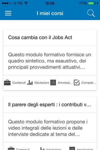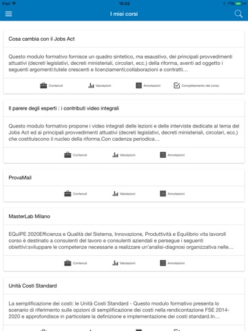 I materiali formativi sono pensati per essere fruiti in mobilità da smartphone e tablet. Ciascun percorso, suddiviso in moduli, consente di fruire di video-lezioni di esperti di materia, consultare tutorial introduttivi e dispense di approfondimento, di sostenere test per l’autovalutazione del proprio apprendimento. Ogni modulo rappresenta un’unità didattica indipendente a cui poter accedere man mano che viene pubblicata sulla app. L’app consente di navigare i moduli formativi anche offline, ad esclusione delle videolezioni che richiedono la connessione Internet per lo streaming video.