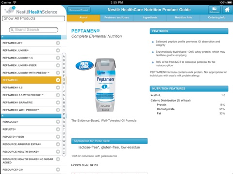 The Nestlé Medical Hub Mobile App provides healthcare professionals with a comprehensive overview of the nutrition products that Nestlé Health Science offers, including ingredients, product features and complete nutrient profiles. This resource is updated in real-time whenever products change or new products are available, so you can trust that you have the latest information to help you make decisions about how to feed your patients.