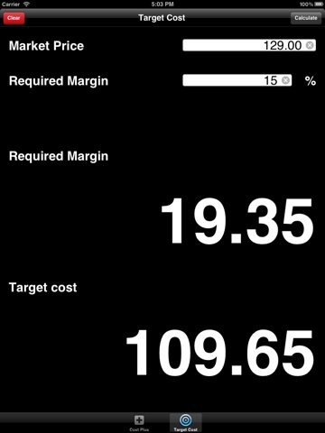 Secondly, the App has a target cost app. This is used when a product must be sold at a specific market price, therefore by removing the required margin, you get the target cost you must produce / buy in your product at to meet your required margins.