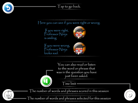 The app offers a unique method for vocabulary learning, based on repetitive practicing and tests. In short - if you’ve ever used flashcards for foreign language learning, you will surely like the Professor Ninja concept. However our app offers much more than traditional flashcards do. It contains 1000 carefully selected words and phrases, covering the main areas of everyday vocabulary (eg. family, numbers, nature, travel, school, pastimes).