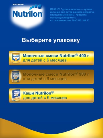Для работы приложения, вам понадобится одна из следующих упаковок продуктов для детей старше 6 месяцев: Молочные смеси Nutrilon 400 г, Молочные смеси Nutrilon 900 г или упаковка Каши Nutrilon.